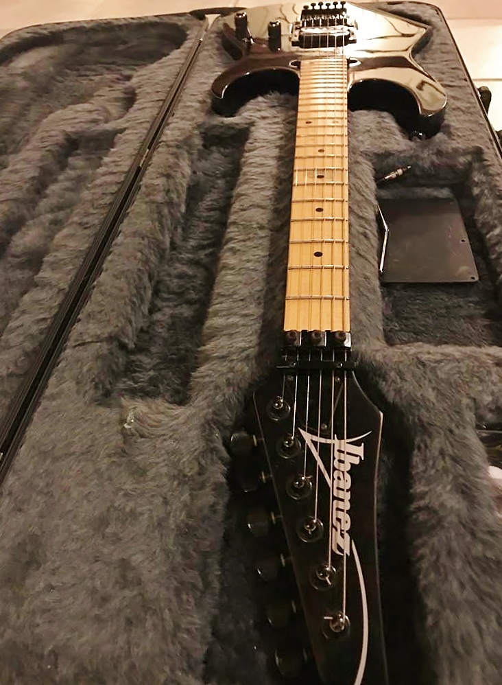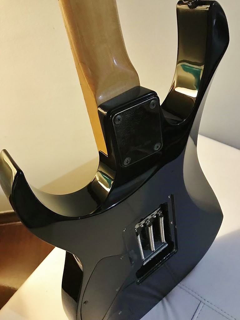 Essa guitarra, na cor preta, é uma das mais raras Ibanez já produzidas. A RG565 foi produzida apenas em 1991 e 1992, sendo que a preta foi lançada apenas em 1991, e se tornou uma guitarra rara e desejada. É até possível achar poucas unidades de outras cores desse modelo, mas na cor preta é praticamente impossível. Eu demorei quase 20 anos para encontrar essa guitarra nesse estado e nessa cor. Trouxe do Alaska. É raríssimo encontrar uma dessas a venda, na cor preta, nesse estado e toda original. É praticamente impossível achar. O braço é um Wizard extremamente confortável. A guitarra está com trastes perfeitos, ação baixíssima. O braço dela é mais confortável que o braço da da RG550. O braço da RG550 é mais largo, sendo que o braço da RG565 é mais apropriado ao conforto de quem possui mãos menores.