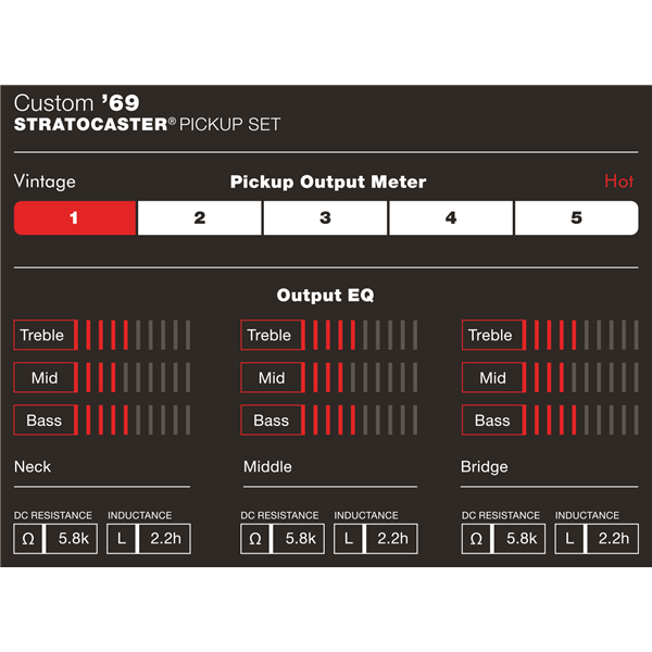 O som tirado em várias Fender Custom Shop Stratocaster®, os captadores single-coil Fender Custom Shop Custom '69 Strat produzem o timbre encorpado que definiu o rock no final dos anos 60. É especialmente eficaz com pedais.