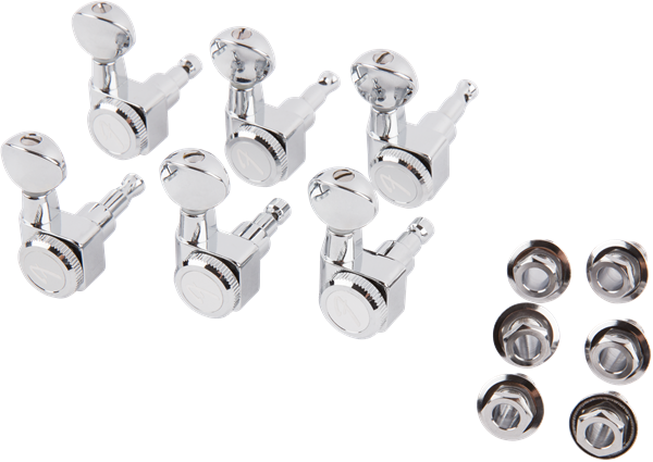 Conjunto de seis tarraxas projetadas para atender a maioria das guitarras Fender de estilo moderno e com configuração de dois pinos na montagem.